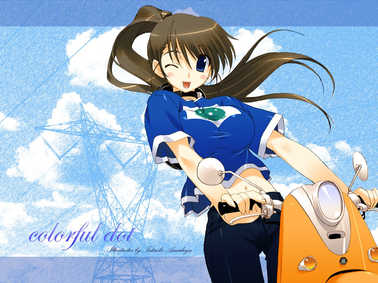 blue eyesbrown hairlong hairmidriffmotor vehiclemotorcycleone eye closedponytailscootersolowink