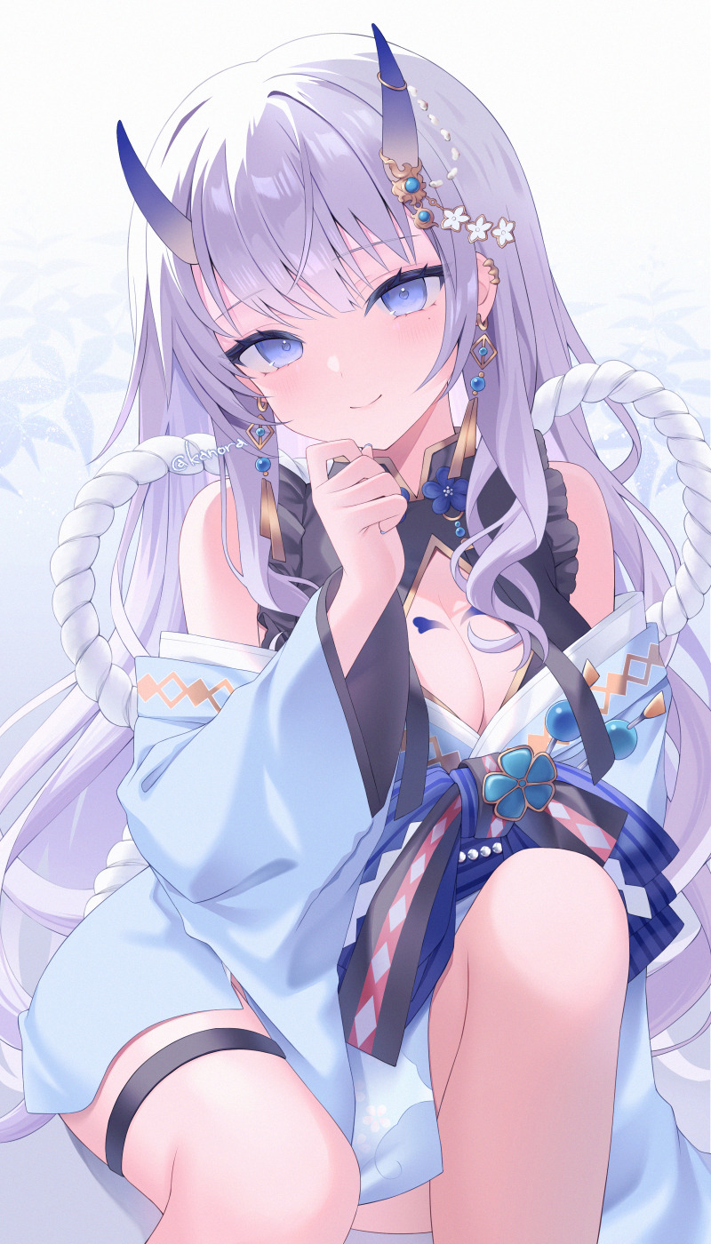 mm (mhm2592), yuuka (blue archive), blue archive, absurdres, highres, 1girl, black halo, black skirt, blush, closed mouth, hair between eyes, halo, hand on own hip, id card, long hair, looking at viewer, purple eyes, purple hair, shirt, skirt, sleeves rolled up, solo, sweatdrop, two side up, white shirt