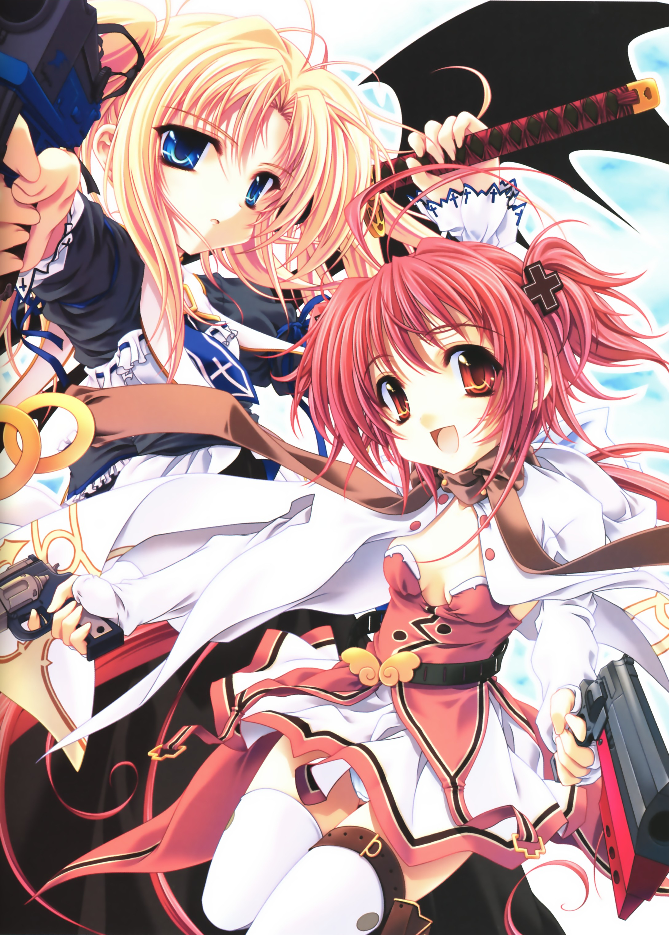 2girlsantenna hairbeltblonde hairblue eyesbreastscapecleavagecrosscrossoverdual wieldingfingerless glovesflat chestfrillsglovesgunhair ornamentholdinglong hairmultiple girlsnecktiepantiespantyshotred eyesred hairscarfshort twintailsskirtskysmall breastsswordthigh strapthighhighstwintailsunderwearvery long hairweaponwhite thighhighs