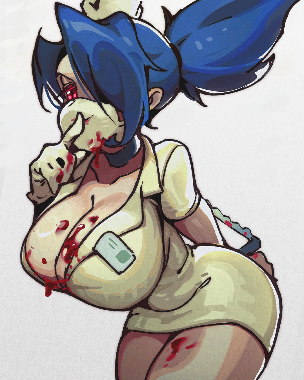 1girlbloodblood on clothesblood on faceblue hairbonesawbreastschokercleavagecollarbonecowboy shotfinger to mouthglovesgrey backgroundhair over one eyehatholdingholding weaponindex finger raisedlarge breastslatexlatex gloveslooking at viewermaskmouth maskname tagnurse capponytailred eyessawshushingsmilesolosurgical maskweapon