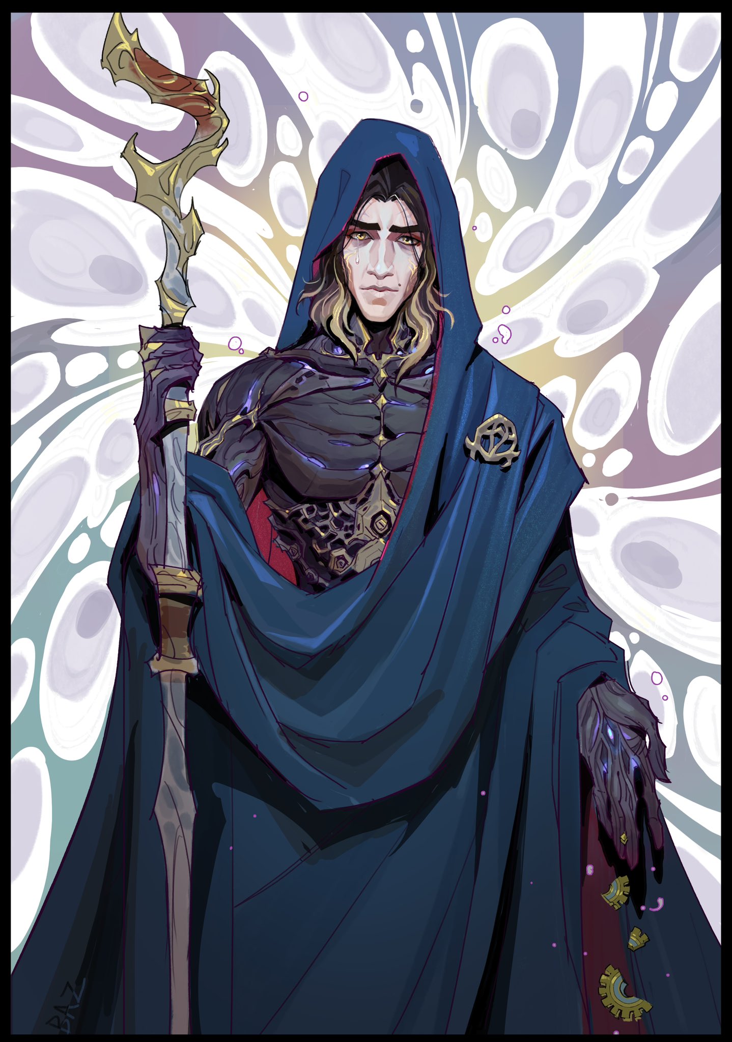1boyblack skinblue robebrown eyesbrown hairclosed mouthcolored skincowboy shotcryingcrying with eyes opengradient hairholdingholding stafflooking at viewermale focusmedium hairmolemole above mouthmulticolored hairrobesolostaffstandingstraight-ontears