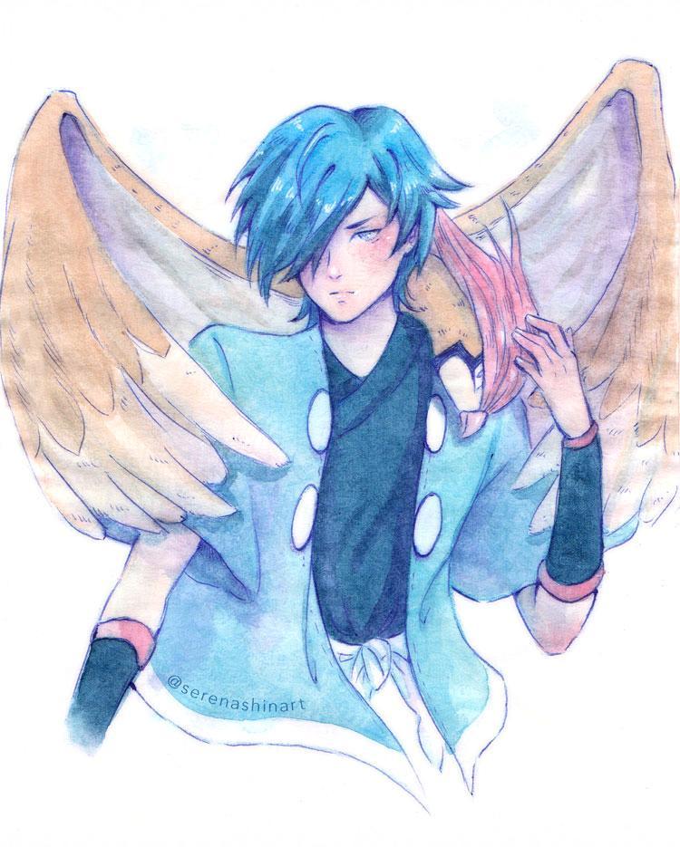 coconut 2611, sinclair (project moon), limbus company, project moon, highres, 1boy, animal legs, bandage on face, bandage over one eye, bandaged arm, bandages, blonde hair, brown feathers, brown scarf, brown wings, conical hat, feathers, grey background, hat, hat feather, heishou pack-you branch (identity) (project moon), holding, holding weapon, looking at viewer, male focus, red eyes, red feathers, red tail, rice hat, scarf, short hair, simple background, solo, upper body, weapon, wings