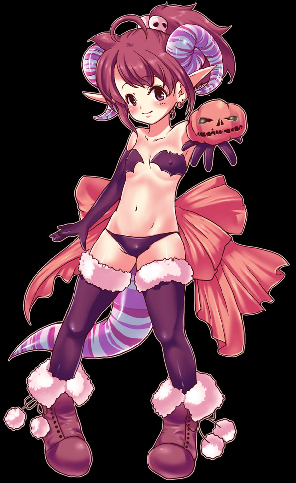 demon girlelbow glovesflat chestgloveshalloweenlong hairpointy earsponytailpurple eyesred hairsolotailthighhighs