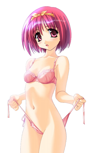 1girlblushbowbrabreastscleavagefemale focushair ribbonhairbandlingerienavelpantiespink eyespink hairpink pantiesred hairribbonshort hairside-tie pantiessmall breastssolostandingtransparenttransparent backgroundunderwearunderwear onlyundressingyellow bow