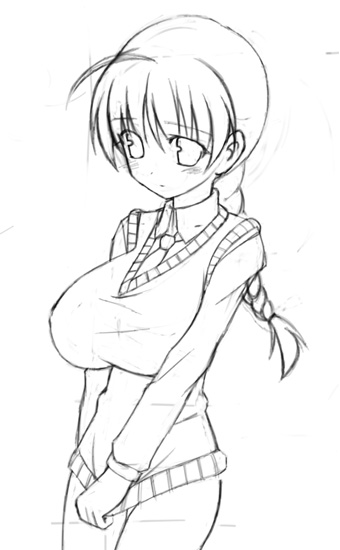 00s1girlblushbraidbreastsfemale focusgreyscalehuge breastslong hairlooking at viewermonochromenecktieponytailschool uniformserafukusimple backgroundsingle braidsketchsolostandingsweater vestwhite background
