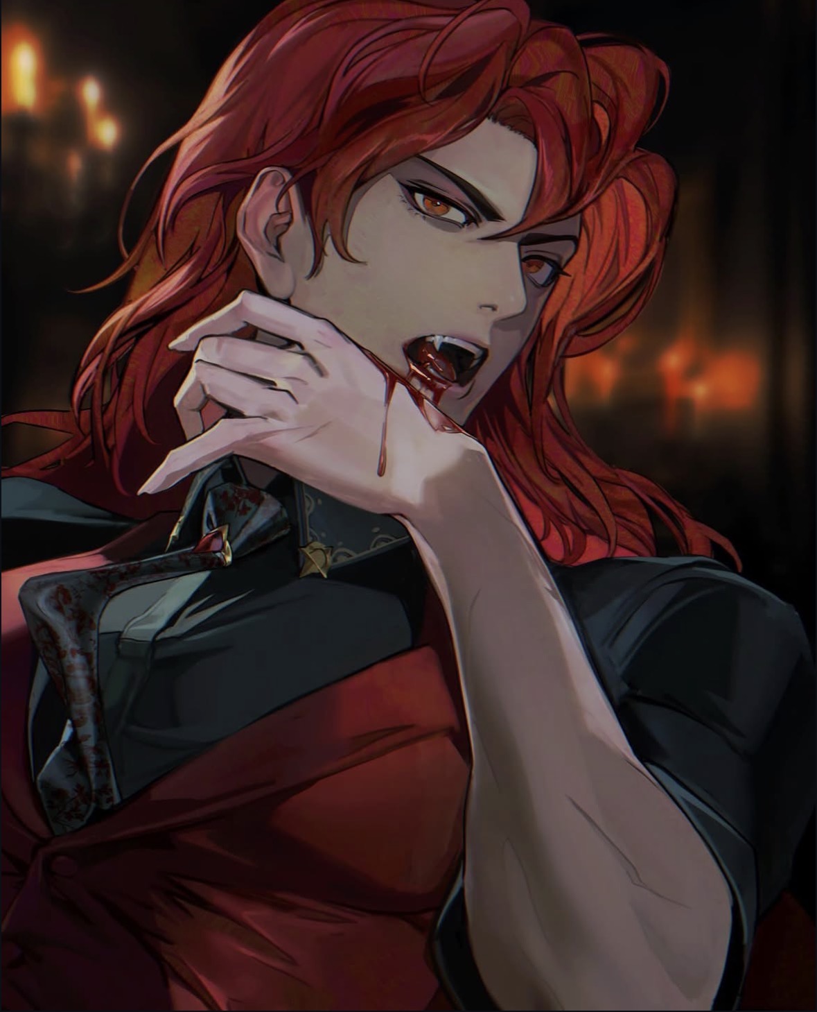 1boybare armsbloodblood on facecohoochiedustcollared shirtgoth fashionhand on own facelong hairmale focusmuscularmuscular malered eyesred hairred shirtshirtvampire