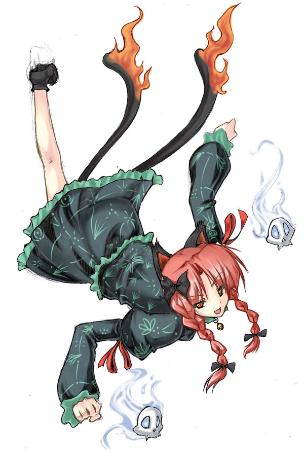 1girlanimal earsbellbraidcat earscat girlcat tailfemale focusfireflame-tipped tailfloating skullflyingjingle bellmultiple tailsred eyesred hairribbonskullsolotailtwin braidstwintails