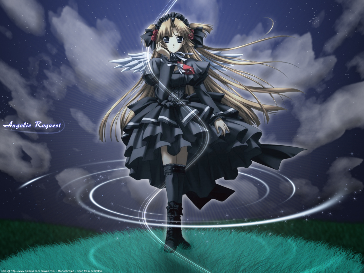 1girlangel wingsblack eyesblack thighhighsblonde hairblue eyesbrown hairclouddressfemale focusgothic lolitalolita fashionlong hairnaturenightoutdoorsskysolothighhighswindwingszettai ryouiki