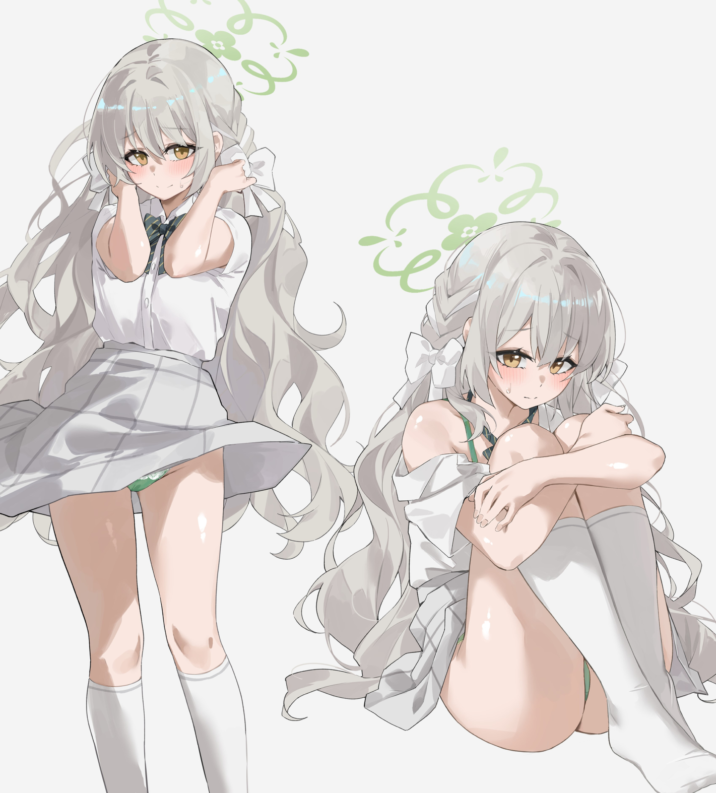 1girlblushbreastsgreen pantiesgrey hairhalokneehighslong hairlooking at viewermedium breastsmultiple viewspantiesshirtshort sleevessittingskirtsocksunderwearyellow eyes
