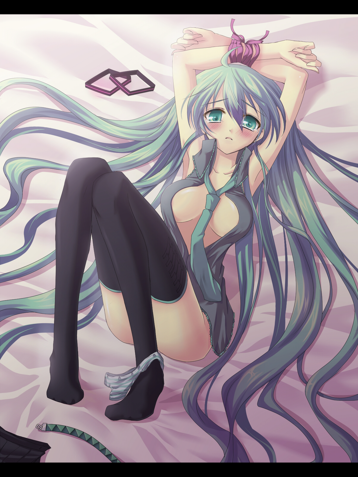 1girlbdsmblushbondageboundbreastsconvenient legfemale focusgreen hairletterboxedlong hairnecktieno pantiespantiespanties around legskirtsolotearsthighhighsunderwear