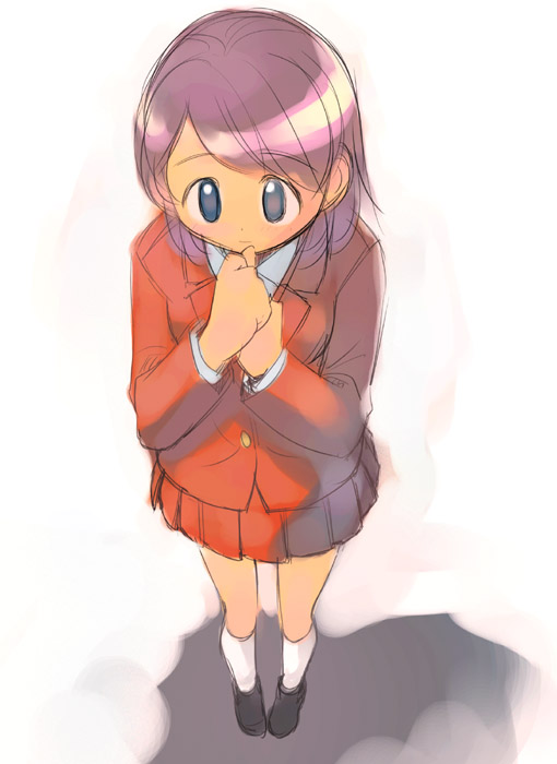 1girlblazerblue eyesblushfemale focusfull bodyjacketkneehighsloaferslong sleevespleated skirtpurple hairred skirtshoesshort hairsimple backgroundskirtsockssolostandingwhite backgroundwhite socks