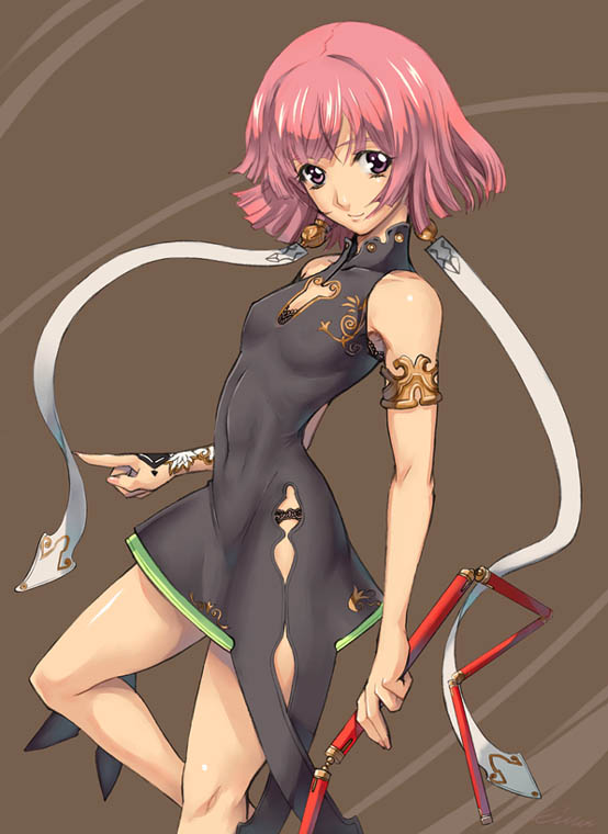 china dresschinese clothesdressearringsjewelrypink hairpurple eyesshort hairskin tightsoloweapon
