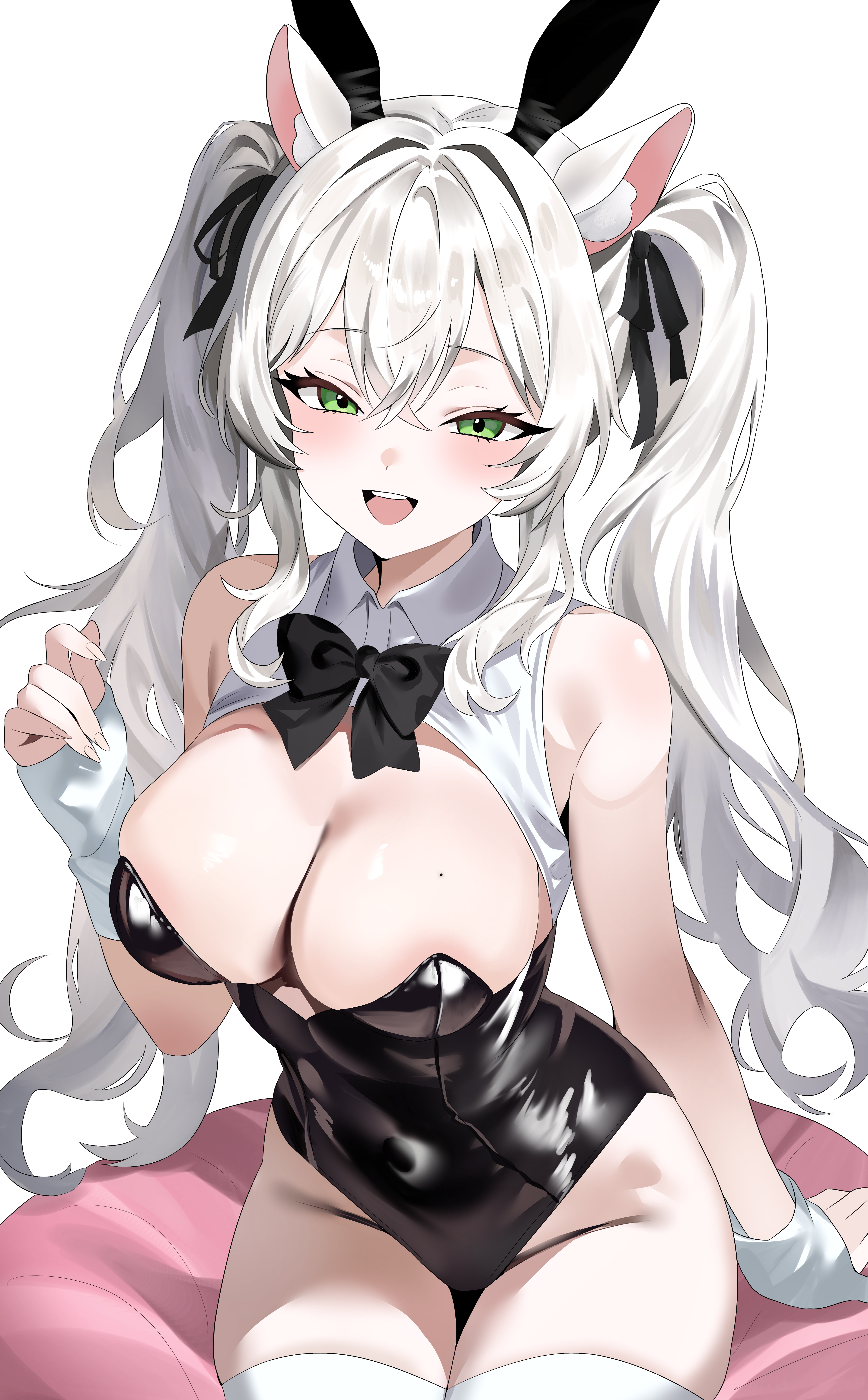 1girlanimal earsblack bowblack leotardblack ribbonblue eyesbowbreastsfake animal earsgrey hairhair ribbonhighleghighleg leotardlarge breastsleotardlong hairlooking at viewermolemole on breastopen mouthplayboy bunnyrabbit earsrabbit girlribbonsittingsolostraplessstrapless leotardteeththighhighstwintailsupper teeth onlywhite thighhighs