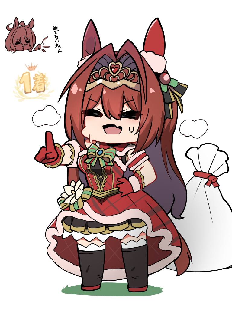 :d2girlsanimal earsblack bootsblack skirtblushbootsbowbrown hairchibiclosed eyesdressfanggameplay mechanicsglovesgreen bowhair between eyeshair intakeshand on own hiphorse earshorse girlhorse taillong hairmultiple girlsopen mouthoutstretched armparty popperplaid clothesplaid dresspleated skirtpointingred dressred glovessacksimple backgroundskirtsmilesolo focusstandingstriped bowsweattailthigh bootstiaravery long hairwhite background