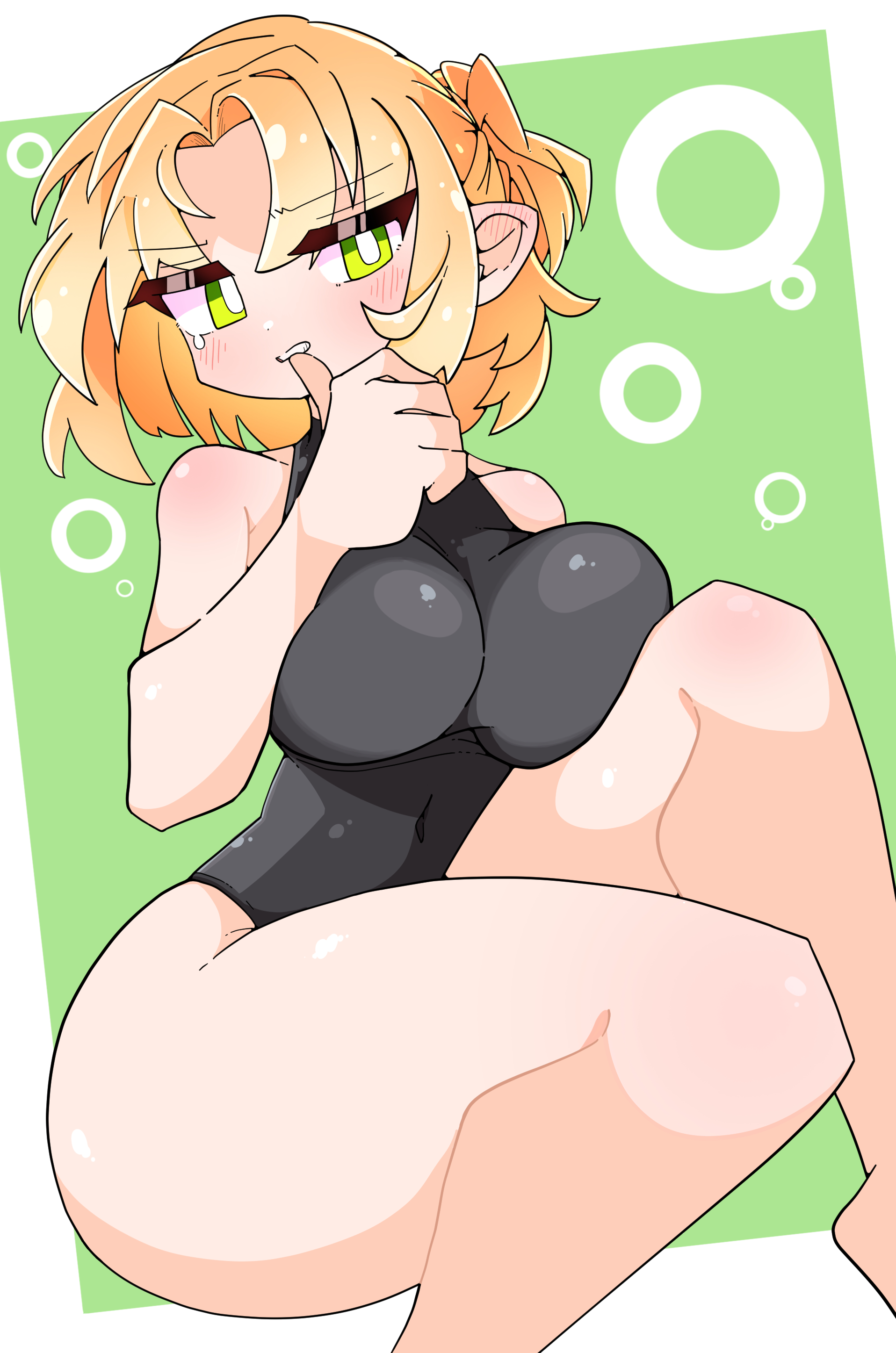 1girlbitingbiting own thumbblack leotardblonde hairblushbreastsbright pupilscovered navelear blushfoot out of framegreen backgroundgreen eyeshalf updolarge breastsleotardlooking at viewerparted bangspointy earsponytailshort hairshort ponytailsolothick thighsthighswhite pupils
