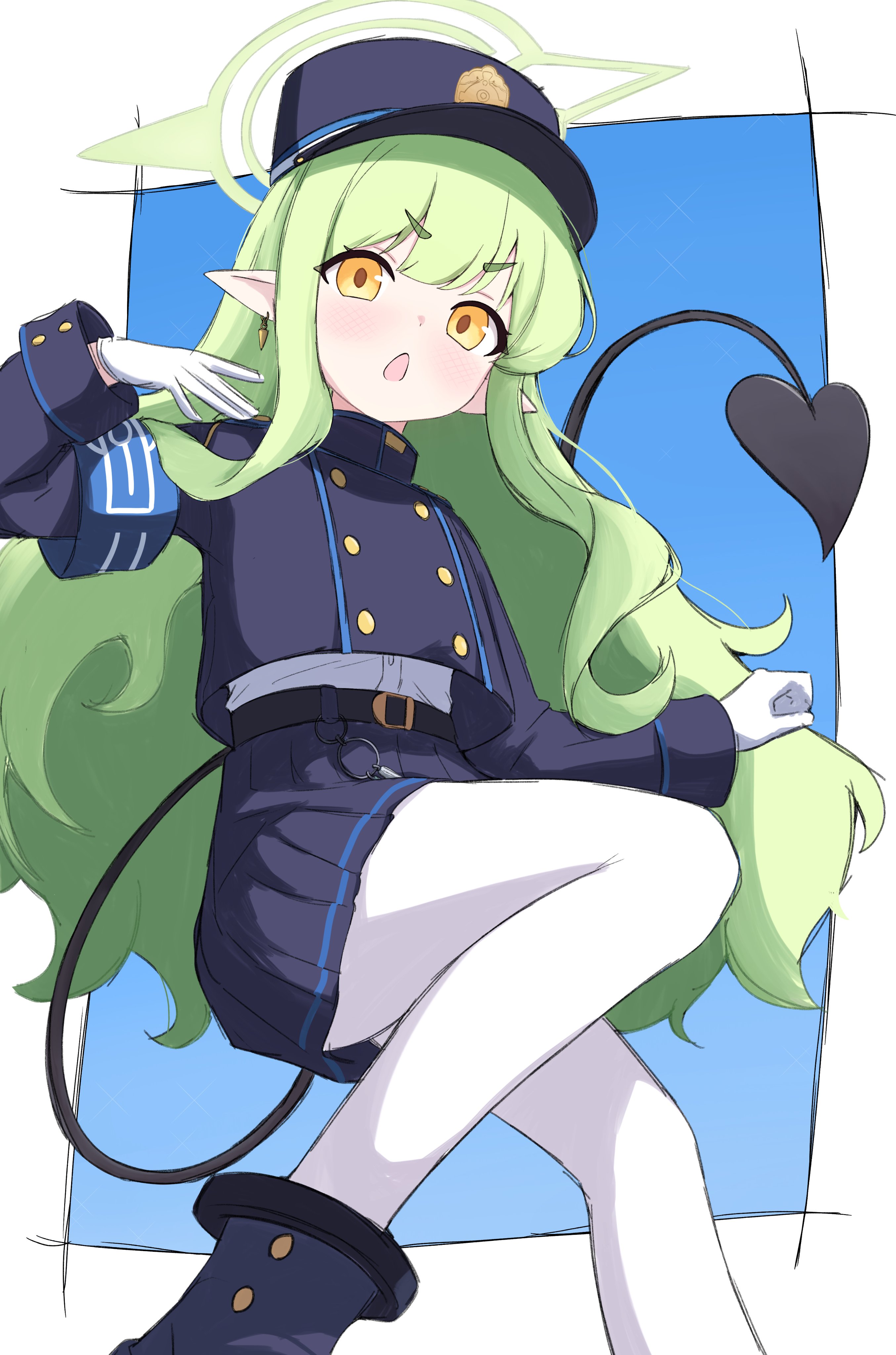 :o1girlarm uparmbandbeltblack beltblack bootsblack skirtblue armbandblue backgroundblue hatblue trimblushbootsbuttonscharm (object)cropped jacketdemon taildouble-breastedfeet out of frameglovesgreen hairgreen halohair intakeshalohatheartheart tailjacketjewelryleg uplight blushlong hairlong sleevespantyhosepleated skirtpointy earssidelockssimple backgroundskirtsleeve cuffssolotailv-shaped eyebrowswhite backgroundwhite gloveswhite pantyhosewhite sleevesyellow eyes