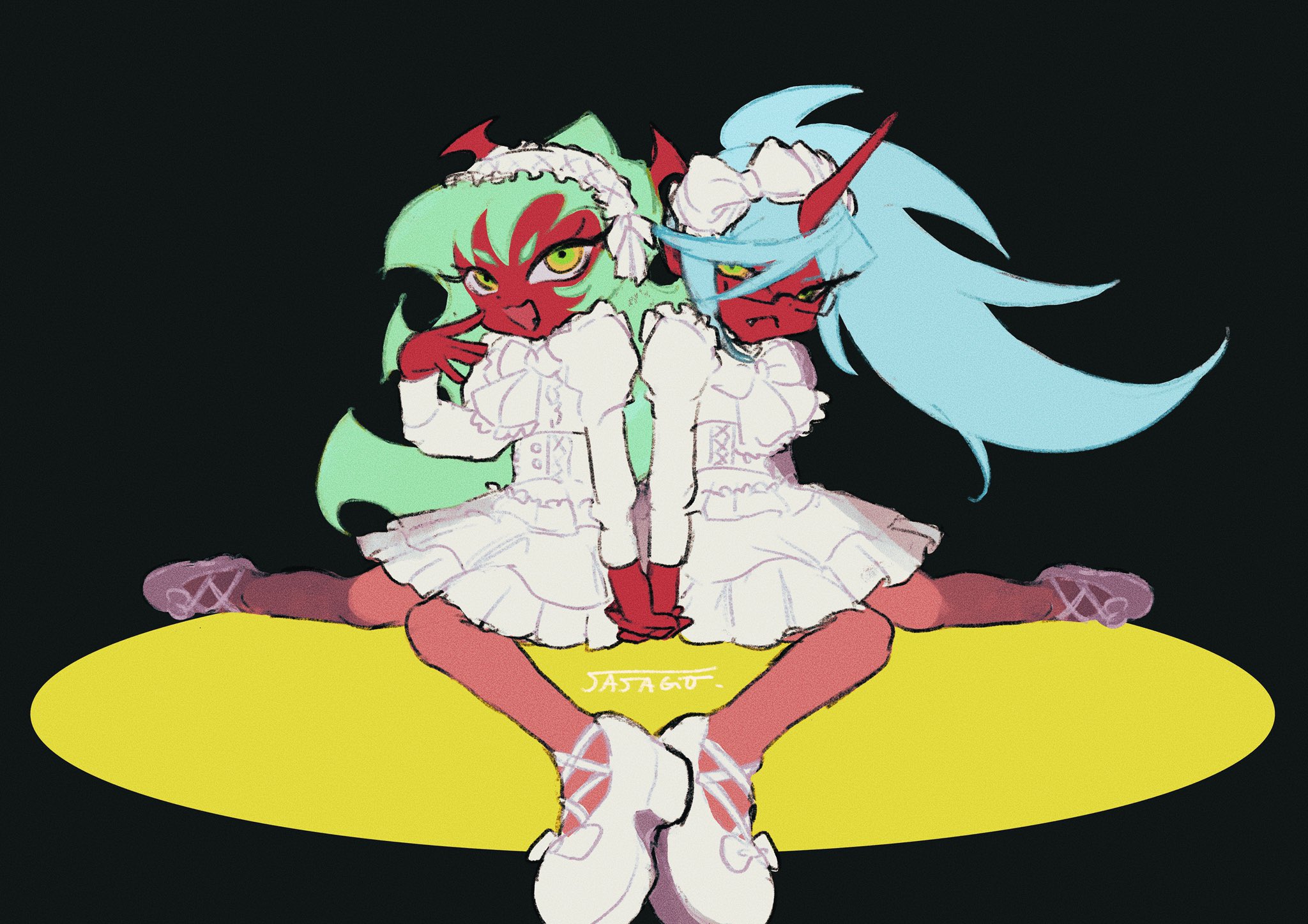 2girlsblue haircolored skindemon girldemon hornsdressgreen eyesgreen hairhornslong hairmultiple girlsred skinsasagupenwhite dress
