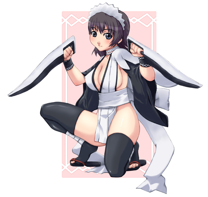1girlblack hairbreastscleavagefeetfemale focusjapanese clotheslarge breastsmaidsandalsshort hairsideboobsoloswordthighhighstoeless legweartoesweapon