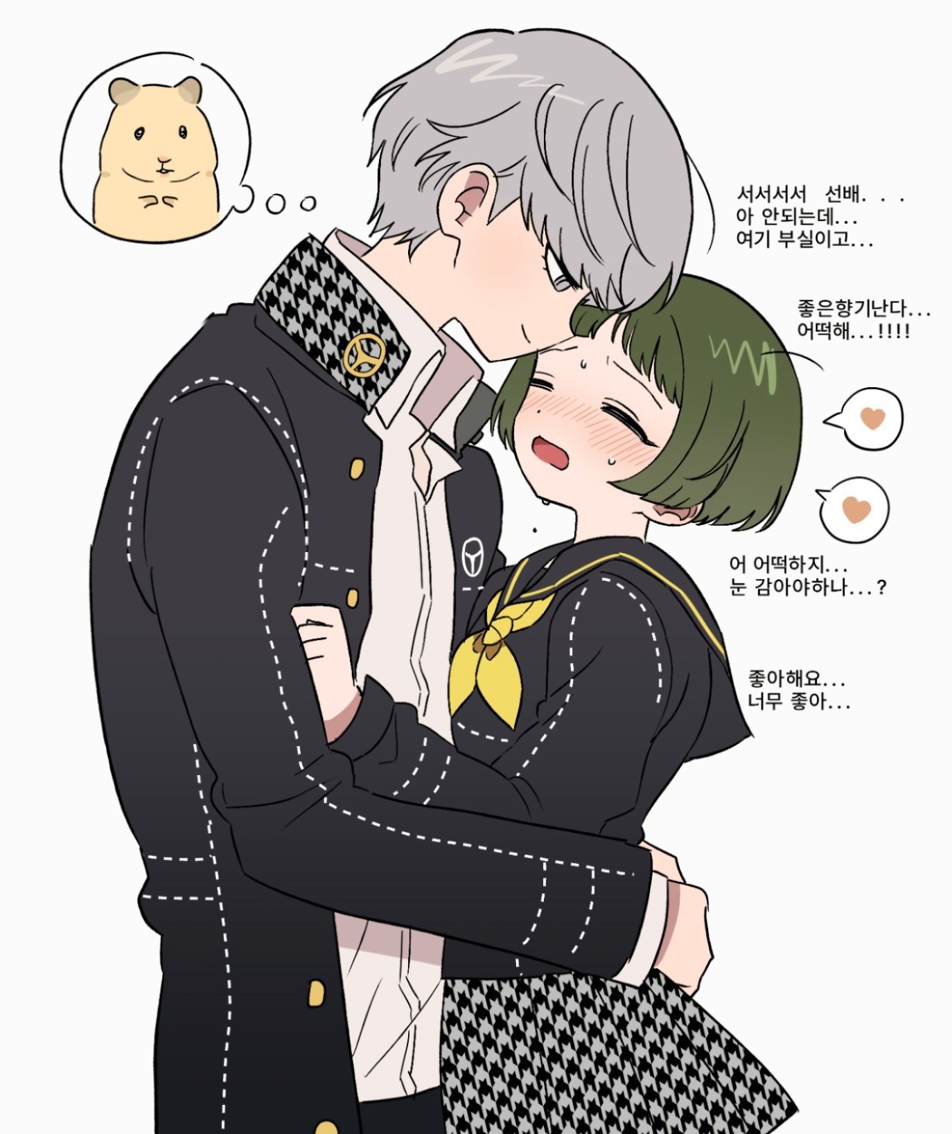 nabeoishi 705, ayase momo, takakura ken (dandadan), dandadan, highres, 1boy, 1girl, arm around back, black choker, black hair, black jacket, black pants, blush, bow, bowtie, breasts, choker, clenched hand, closed eyes, collared shirt, couple, cowboy shot, crossed bangs, earrings, furrowed brow, gakuran, glasses, hair between eyes, hetero, hug, jacket, jealous, jewelry, loose socks, medium breasts, medium hair, monochrome, open mouth, own hands together, pants, pleated skirt, round eyewear, school uniform, shirt, shirt under sweater, short hair, skirt, socks, sweatdrop, sweater, twitter username, yellow background