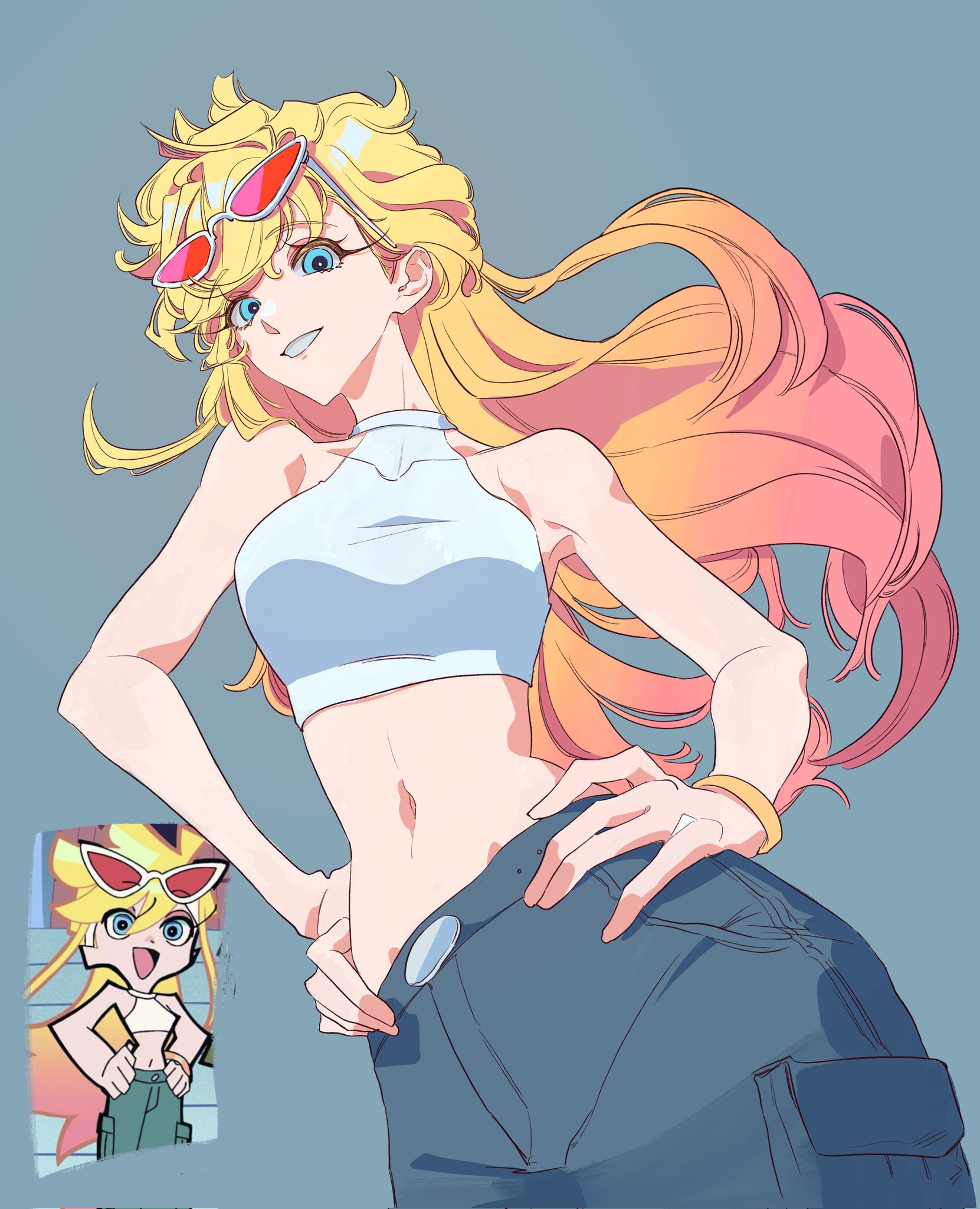 1girlblonde hairblue eyesbreastscrop topdenimeyewear on headgradient hairlooking at viewermedium breastsmulticolored hairpink hairsohia342solo
