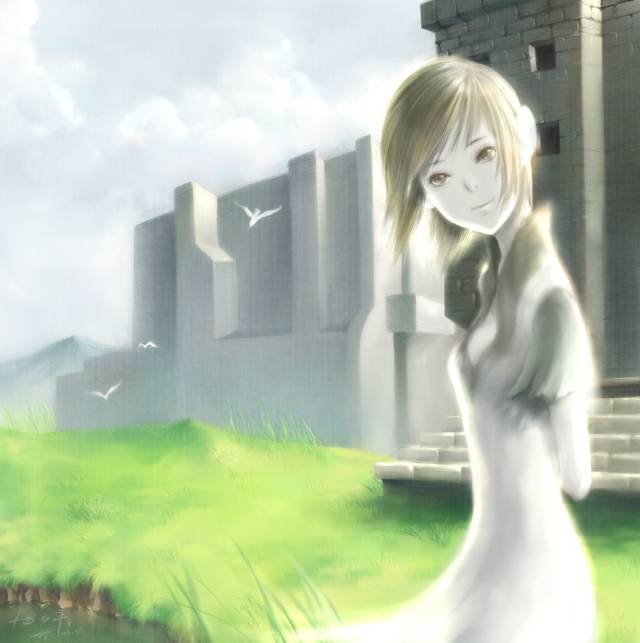 1girlarms behind backbirdblonde hairbrown eyesbrown hairbuildingcloudcloudy skydaydressfieldgrasshead tiltlong hairlooking at viewerpale skinpondshort hairshort sleevesskystairssunlightwaterwhite dress