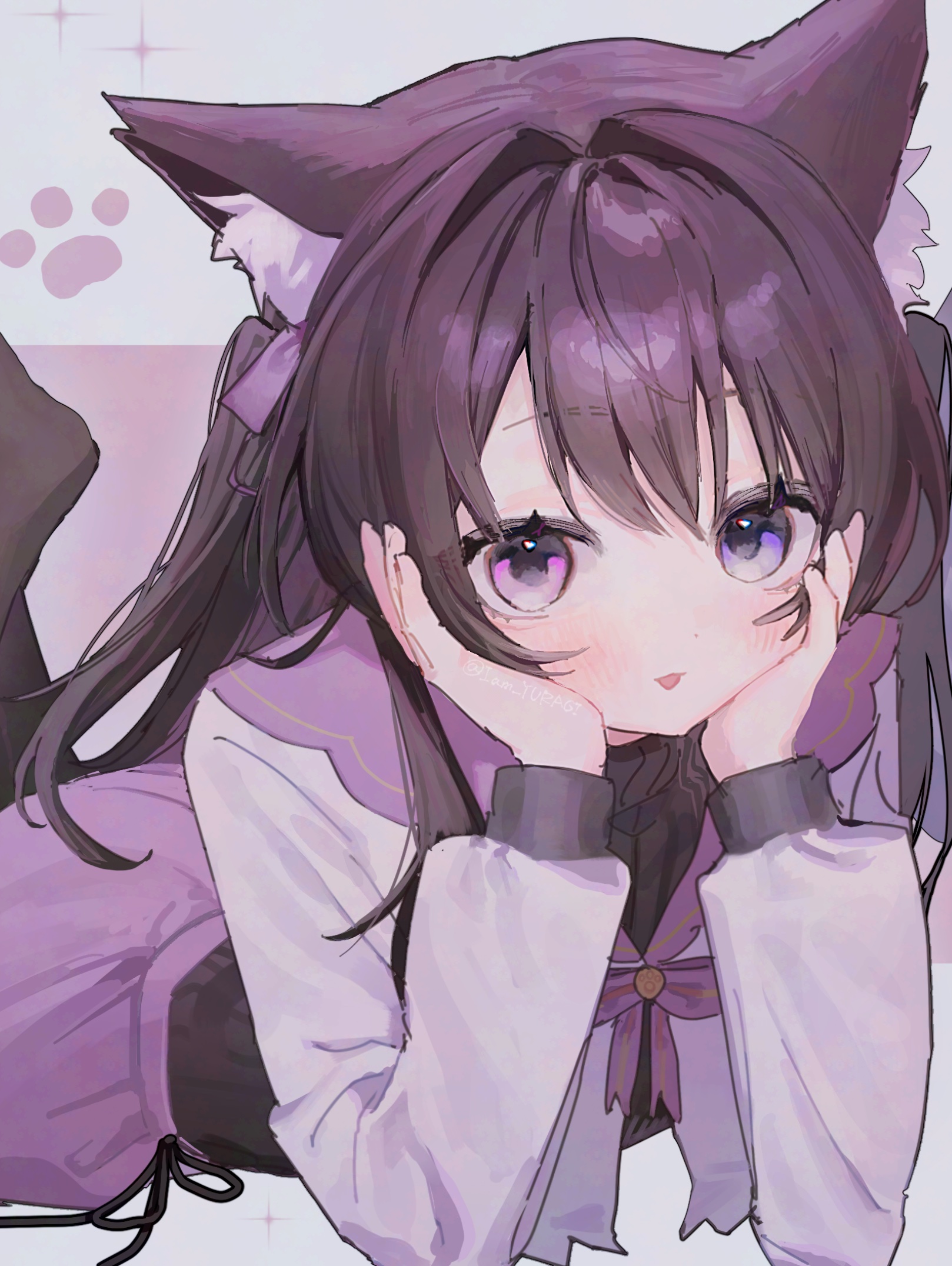 1girlanimal earsblack hairblack shirtblue eyescat earscat girlhand on own cheekhand on own faceheterochromiajacketlong hairlong sleeveslooking at viewerlyingon stomachpaw printpurple eyespurple jacketpurple skirtshirtskirtsolo