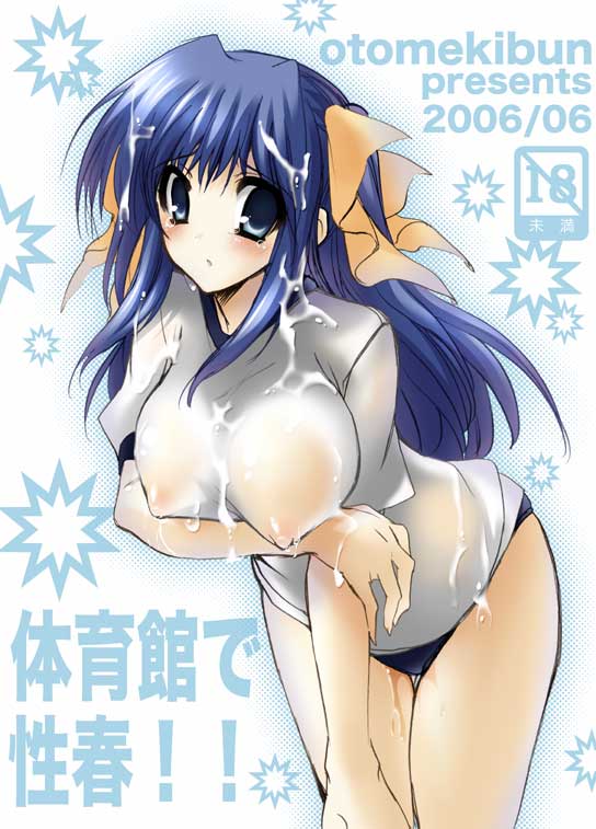 1girlbent overblue eyesblue hairblushbreastsbukkakeburumacumcum on hairfemale focusgym uniformlarge breastsmatching hair/eyesnipplessee-through clothessolotears