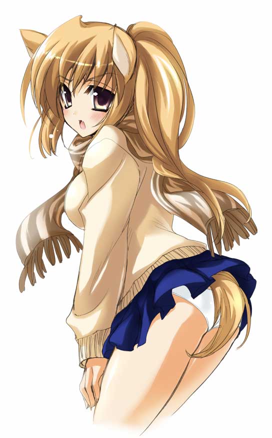 animal earsassblushbrown eyesbrown hairlong hairlooking backpantiespantyshotskirtsolosweatertailunderwearwhite panties
