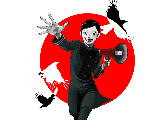 mikakami1e, akari (pokemon), rowlet, nintendo, pokemon, pokemon legends: arceus, highres, 1girl, bird, black hair, black sash, blush, closed eyes, closed mouth, eyelashes, galaxy expedition team survey corps uniform, gen 7 pokemon, grey eyes, headscarf, jacket, long hair, loose socks, one eye closed, open mouth, owl, pantyhose, pokemon (creature), ponytail, red scarf, sash, scarf, shirt, sidelocks, simple background, smile, socks, white headscarf