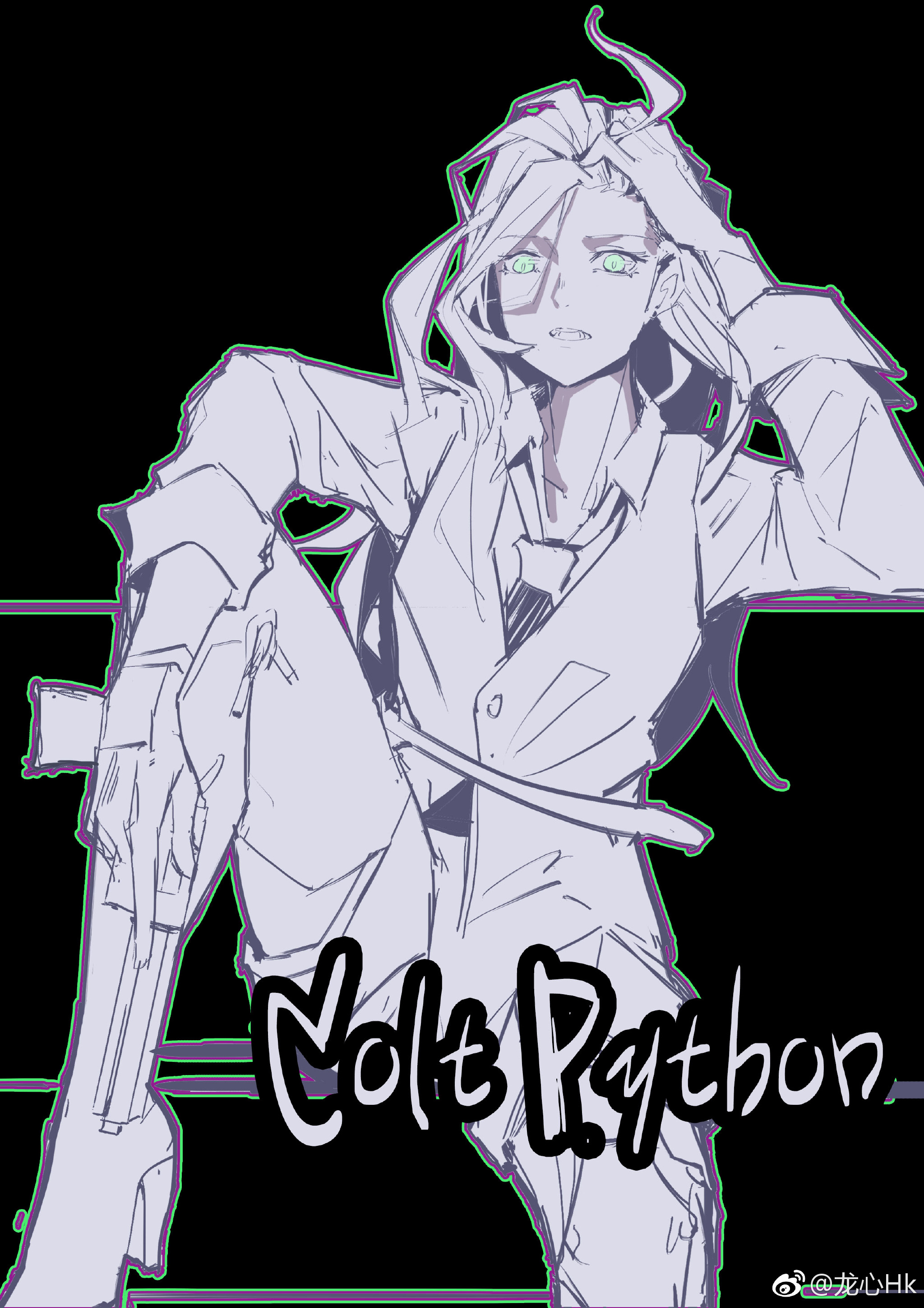 1girlblack glovesbreastsglovesgunhandgunhigh heelsholdingholding gunholding weaponlong hairnecktieopen mouthsittingsoloweapon