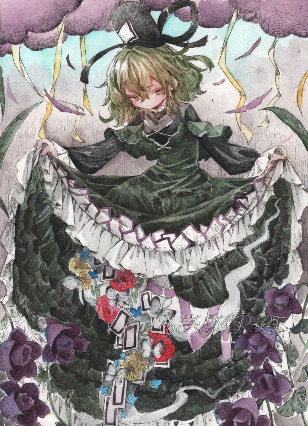 1girlbugbutterflyclothes liftcloudflowergreen hairinsectlong sleevesmedium hairpurple flowerred flowerskirtskirt liftsolothunderyellow flower