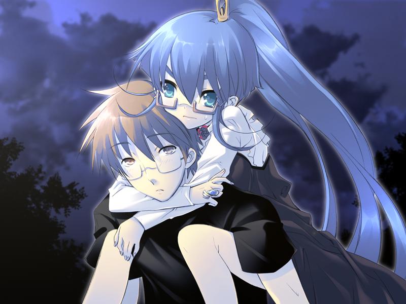00sangryblue eyesblue hairbrown eyesbrown haircarryingclouddressglassesjewelrylong hairnaturenightringskyvery long hair