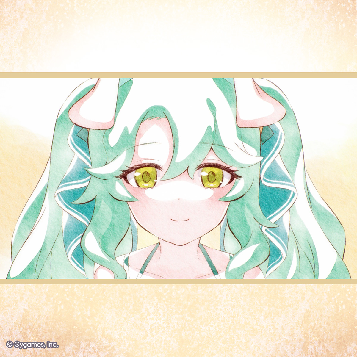 1girlalbum coveranimal earsbare shouldersbikiniclosed mouthcollarbonecompany namecopyright namecopyright noticecoverdot noseenglish textgreen eyesgreen hairhair between eyeshair ribbonlong hairpig earsribbonsimple backgroundsmilesoloswimsuitupper body