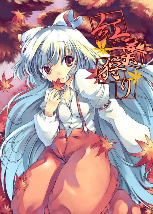 1girlautumn leavesblushcollared shirtcowboy shotfemale focusholdingleaflong sleeveslooking at viewerpantsred eyesshirtsolosuspenderstaremetext focus