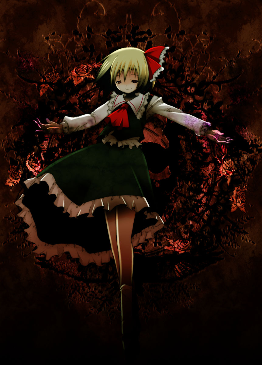 1girlblonde hairdarkdarknessfemale focushair ribbonoutstretched armsred eyesribbonsolospread arms