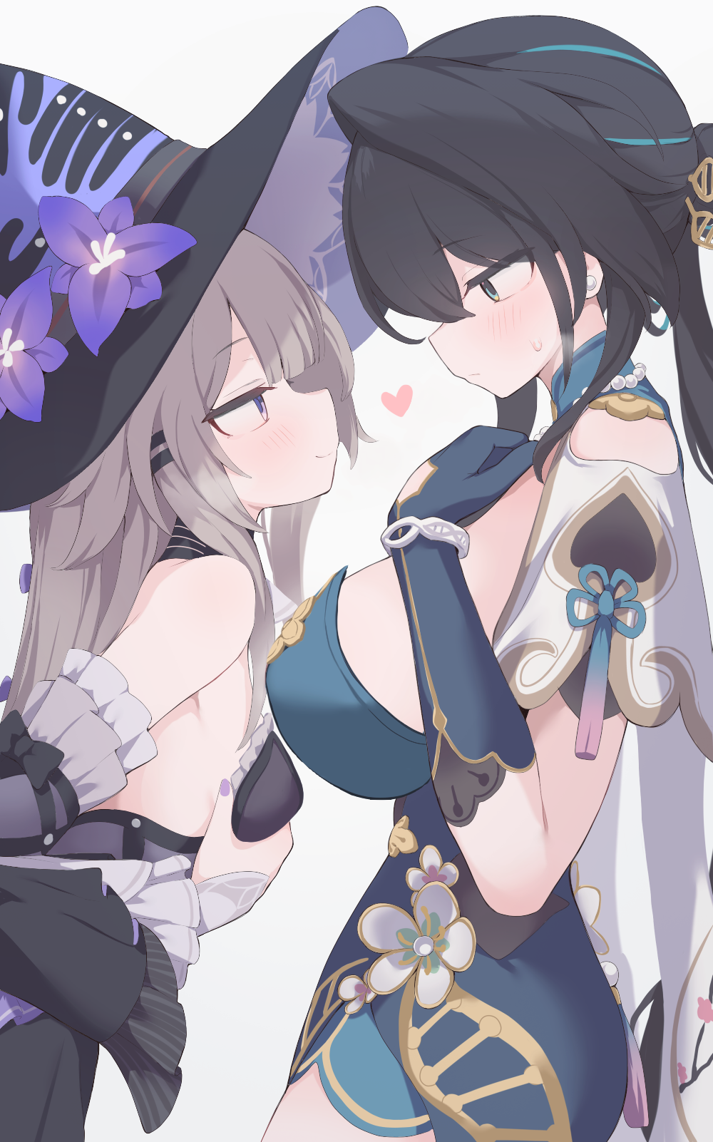 2girlsbare shouldersblack dressblack hatblushbreastsbrown dressbrown hairdetached collardresselbow glovesflowerglovesgold trimgreen dressgreen eyesgreen glovesgrey hairhair ornamenthathat flowerjewelrylarge breastslong hairmultiple girlsnecklacepearl necklaceponytailpurple eyessidelockssmall breastssmiletwo-tone dresswitch hatyuri