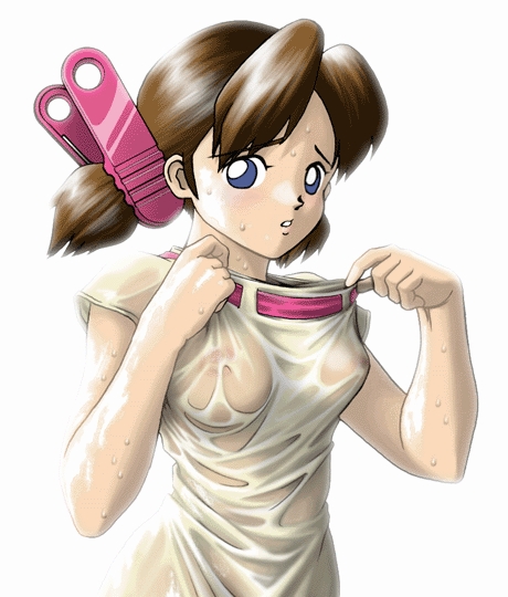 1girlasymmetrical breastsblue eyesblushbreastsbrown haircovered erect nipplesfemale focushair ornamenthaircliplooking at viewermedium breastsno brasee-through clothessee-through shirtshirtsimple backgroundsmall breastssolowetwet clotheswet shirtwhite backgroundwhite shirt