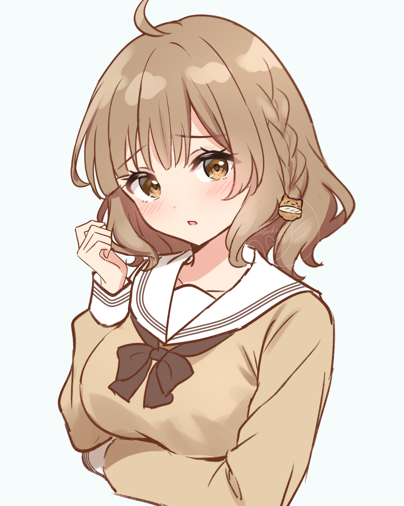 1girlahogearm under breastsblushbowbowtiebraidbreastsbrown bowbrown bowtiebrown shirtcat hair ornamentcollarbonehair ornamenthand uplarge breastslooking at viewermedium hairparted lipsraised inner eyebrowssailor collarschool uniformserafukushirtside braidsimple backgroundsoloupper bodywhite backgroundwhite sailor collar