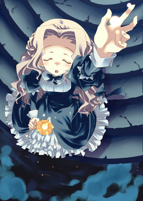 00sblindbrown hairclosed eyesgoth fashionlong hairoutstretched armoutstretched handpumpkinreachingsolo