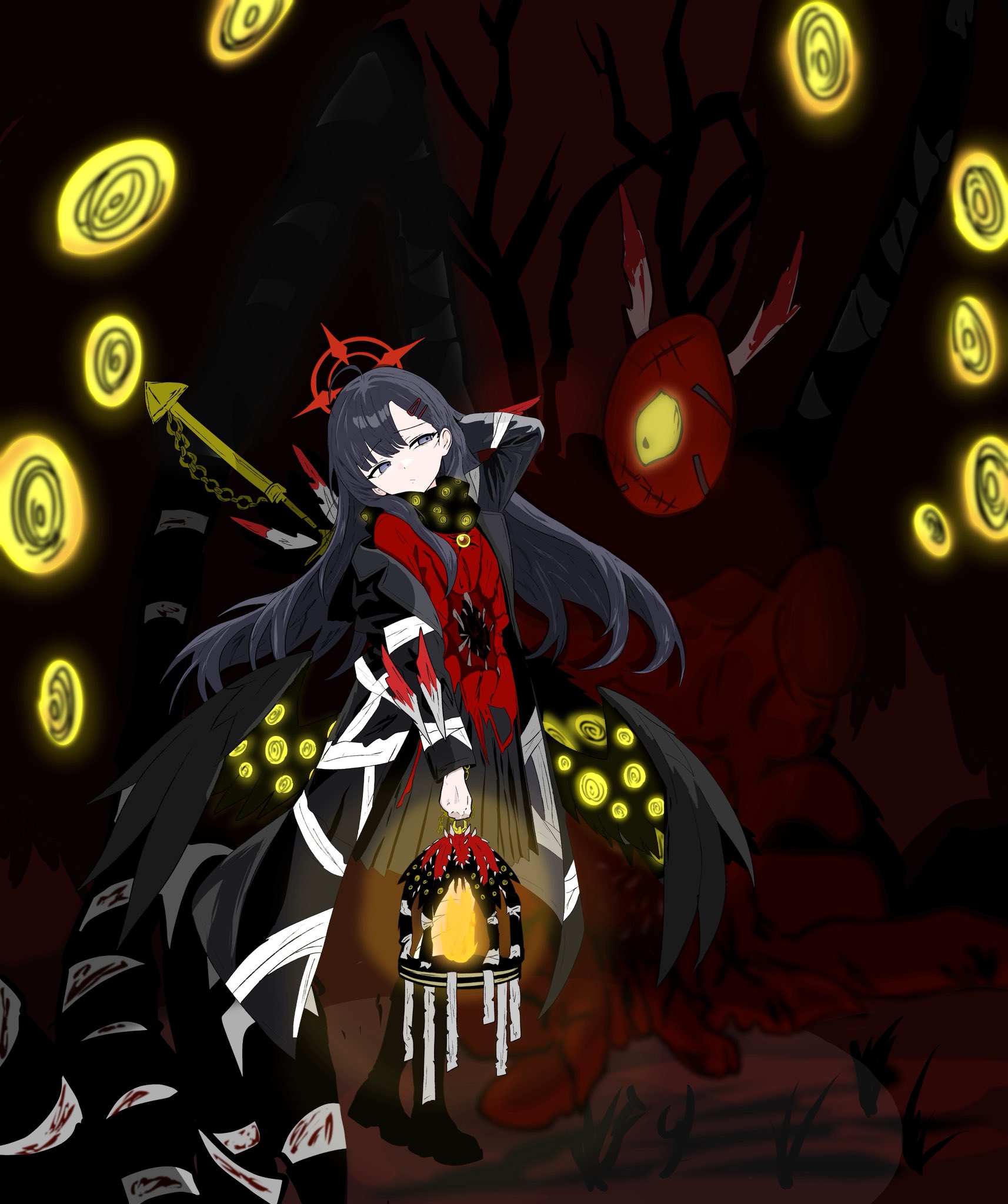 bandagesbirdbird wingsblack hairblack skirtblack wingsclosed mouthe.g.o (project moon)feathered wingsglowingglowing eyeshair between eyeshair ornamenthalohead on handholdingholding lanternlanternlong hairlooking at anotherlow wingsred halored shirtshirtskirttwilight (e.g.o)weaponweapon on backwingsyellow eyes