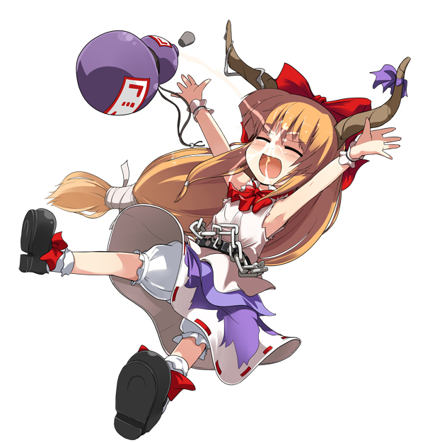 :oalcoholarmpitsarms upblonde hairbloomersclosed eyesgourdhair ribbonhornslong hairoutstretched armsribbonsakeskirtsolounderwearvery long hairwetwhite bloomers