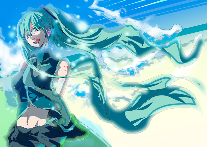 :d1girlaqua eyesaqua hairaqua necktiearms behind backbespectacledblack-framed eyewearcloudcontrailcowboy shotdayeyelashesfemale focusfloating hairfrillsglassesglowinghair between eyeshair ornamenthead tiltheadphoneslong hairnavelnecktieopen mouthskirtskysleevelesssmilesolostomachtattoovery long hair