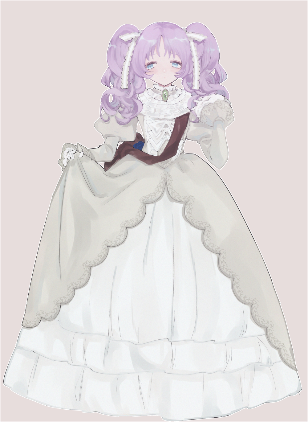 1girlalternate hairstyleblue eyesbroochchoppy bangsclosed mouthdressfacing viewerfull bodygemgreen gemstonegrey backgroundgrey dressjewelrylong dresslong hairlooking to the sidepurple hairsimple backgroundsketchskirt holdsolotareme