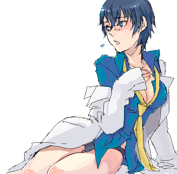 1girlblue eyesblue hairblushbreastscleavagefemale focusmatching hair/eyesmedium breastsnecktieoekakipantiesshirtshort hairsolounderwear