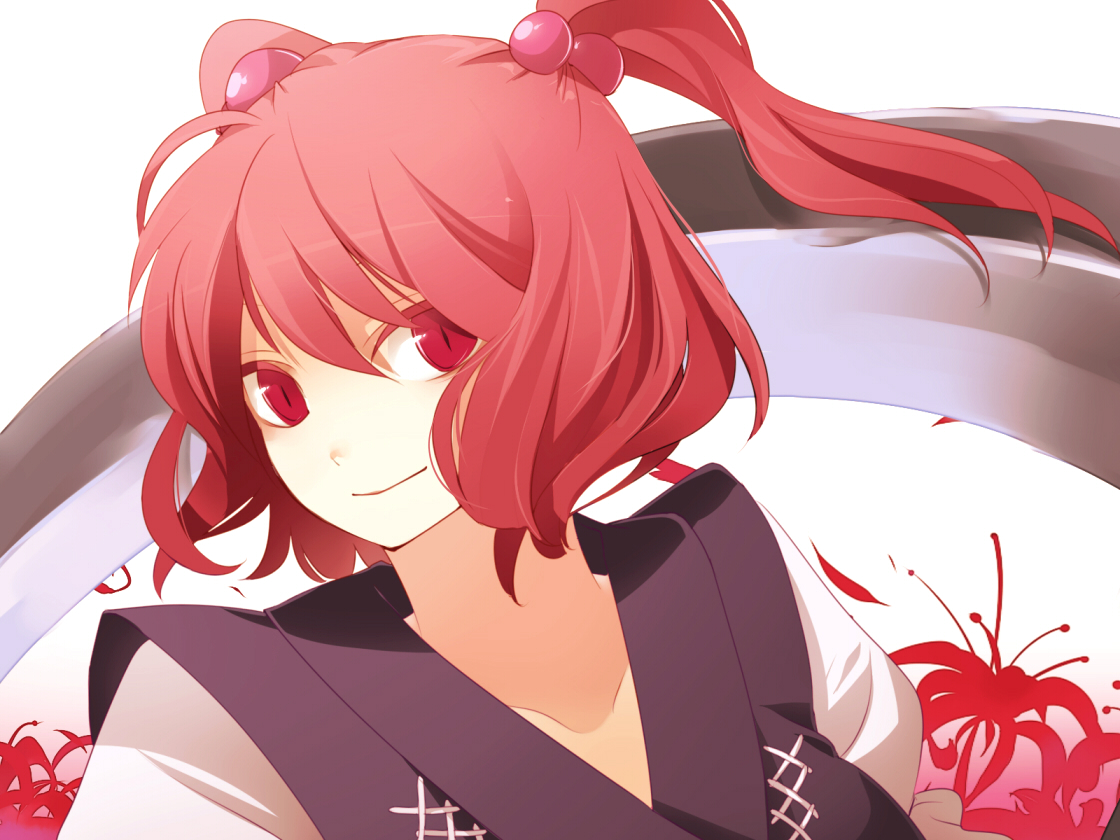 1girlclose-upfemale focusflowerhair bobbleshair ornamentlooking at viewerred eyesred flowerred hairscytheshort hairsimple backgroundslit pupilssmilesolospider lilytwintailstwo side upupper bodywhite background