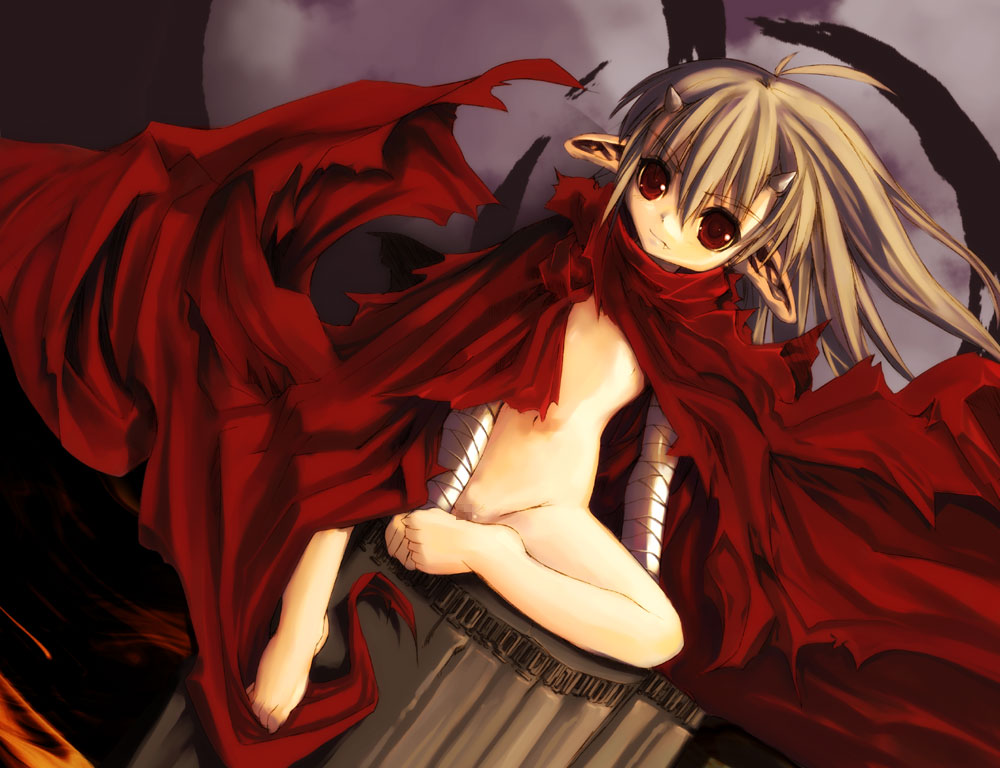 1girlbarefootbrown haircapecensoredfangfeetfemale focushornslolilong hairmosaic censoringnaked capenavelnudepointy earspussyred eyessittingsolo