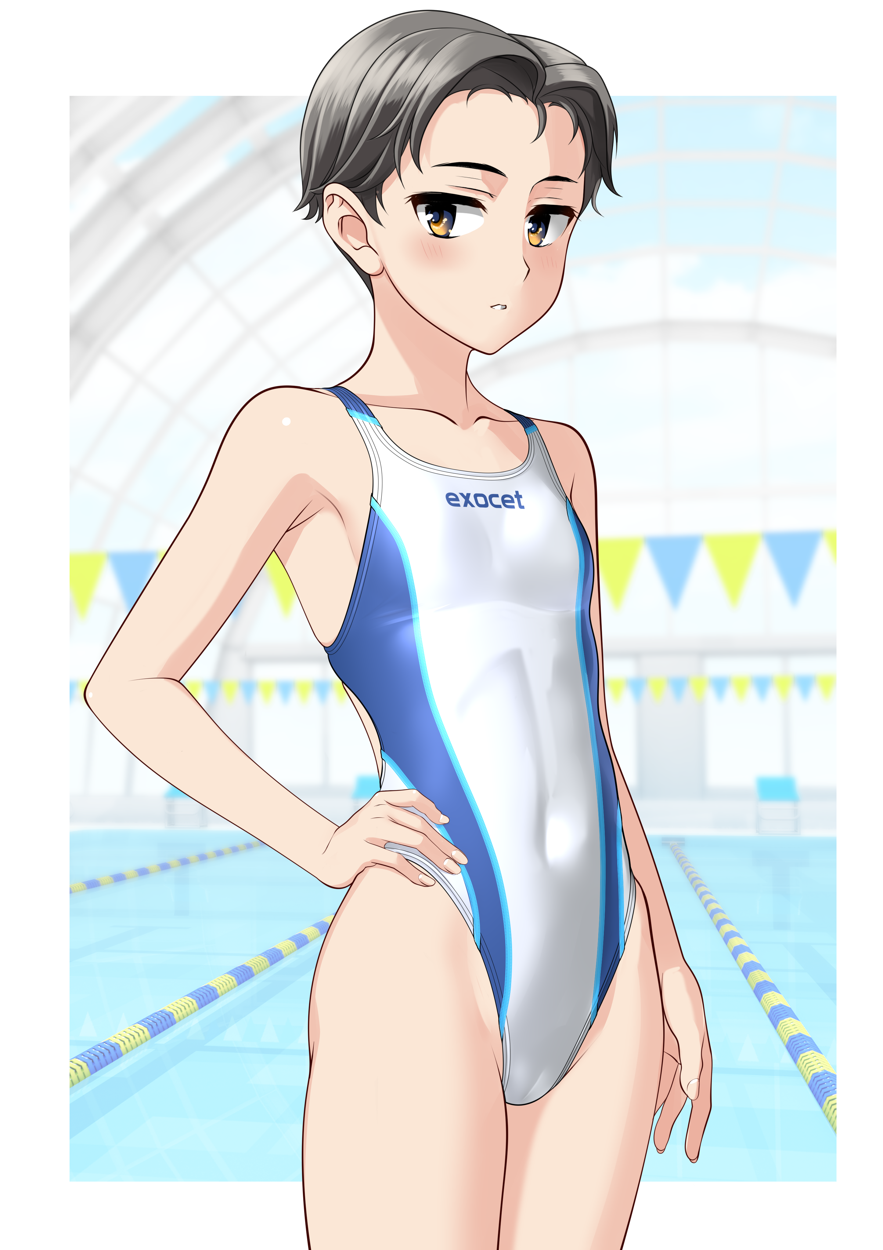 1girlblack eyesblack hairbreastsbrown eyescameltoeclothes writingcompetition swimsuitcovered navelcowboy shotglass ceilinghand on own hiphighleghighleg one-piece swimsuitindoorsone-piece swimsuitpoolshort hairsmall breastssolostring of flagsswimsuittomboytwo-tone swimsuitwhite one-piece swimsuit