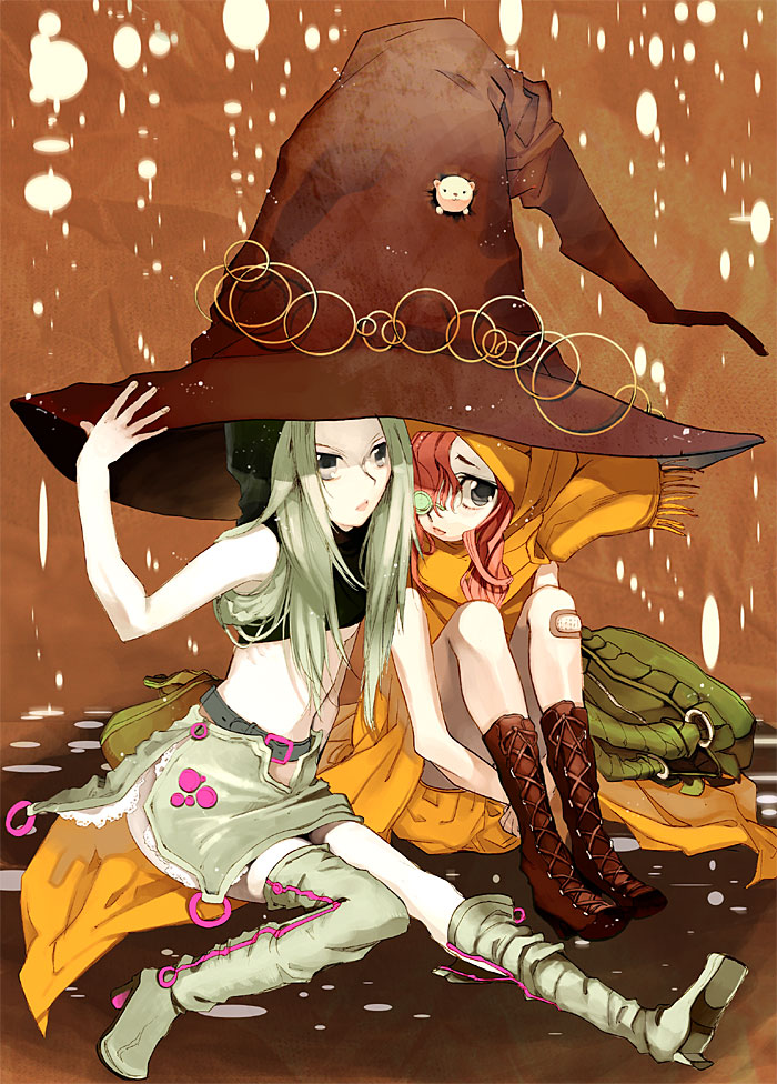 2girlsbagbandaidbeltblack eyesbootsgreen hairhair over one eyehathoodhugging own legslong hairmidriffmultiple girlsred hairscarfsittingskirtthigh bootsthighhighswitch hat