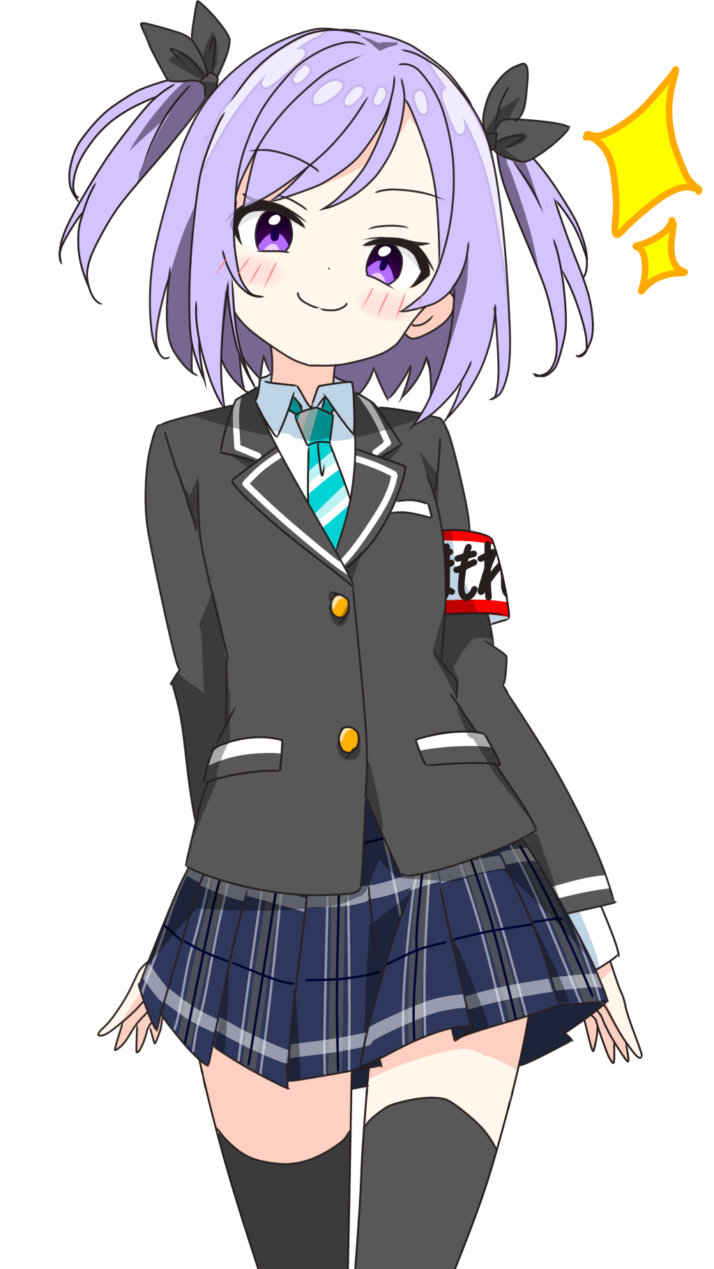 1girlarmbandblack jacketblack ribbonblack thighhighsblue necktieblue skirtblushbuttonsclosed mouthcollared shirtcowboy shotdot nosehair ribbonjacketlong sleeveslooking at viewerminiskirtnecktieplaid clothesplaid skirtpleated skirtpurple eyespurple hairribbonschool uniformshirtshort hairsimple backgroundskirtsmilesolosparklestriped necktiethighhighstwo side upwhite backgroundwhite shirtzettai ryouiki