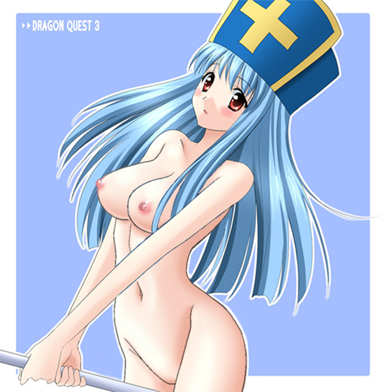 1girlblue backgroundblue hairblushbreastscopyright namefemale focushatlong hairmitrenipplesnudered eyessolo